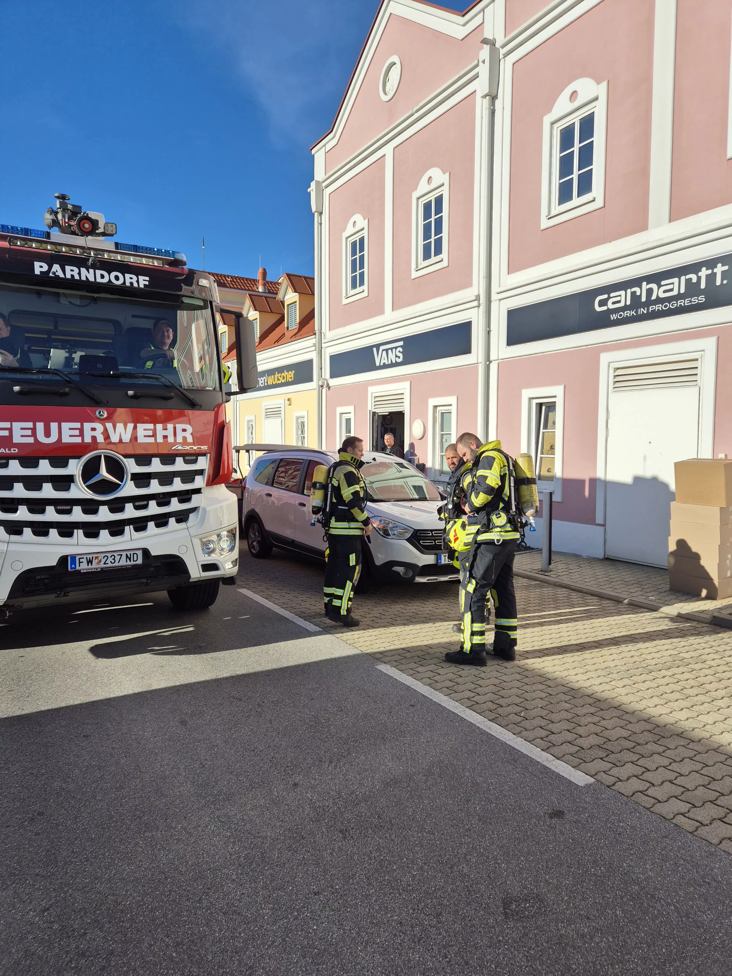 Am Mittwoch heulten um 13:38 Uhr die Sirenen, da ein aufmerksamer Melder im Outlet Center eine Rauchentwicklung in einem Shop wahrgenommen hatte. Durch die Meldung „B1 Brandverdacht im Gebäude“ rüstete sich gleich beim Ausrücken ein Atemschutztrupp aus. Unser Einsatzleiter konnte glücklicherweise nach seiner Erkundung schnell Entwarnung geben, da es sich rein um den Rauch einer E-Zigarette handelte.