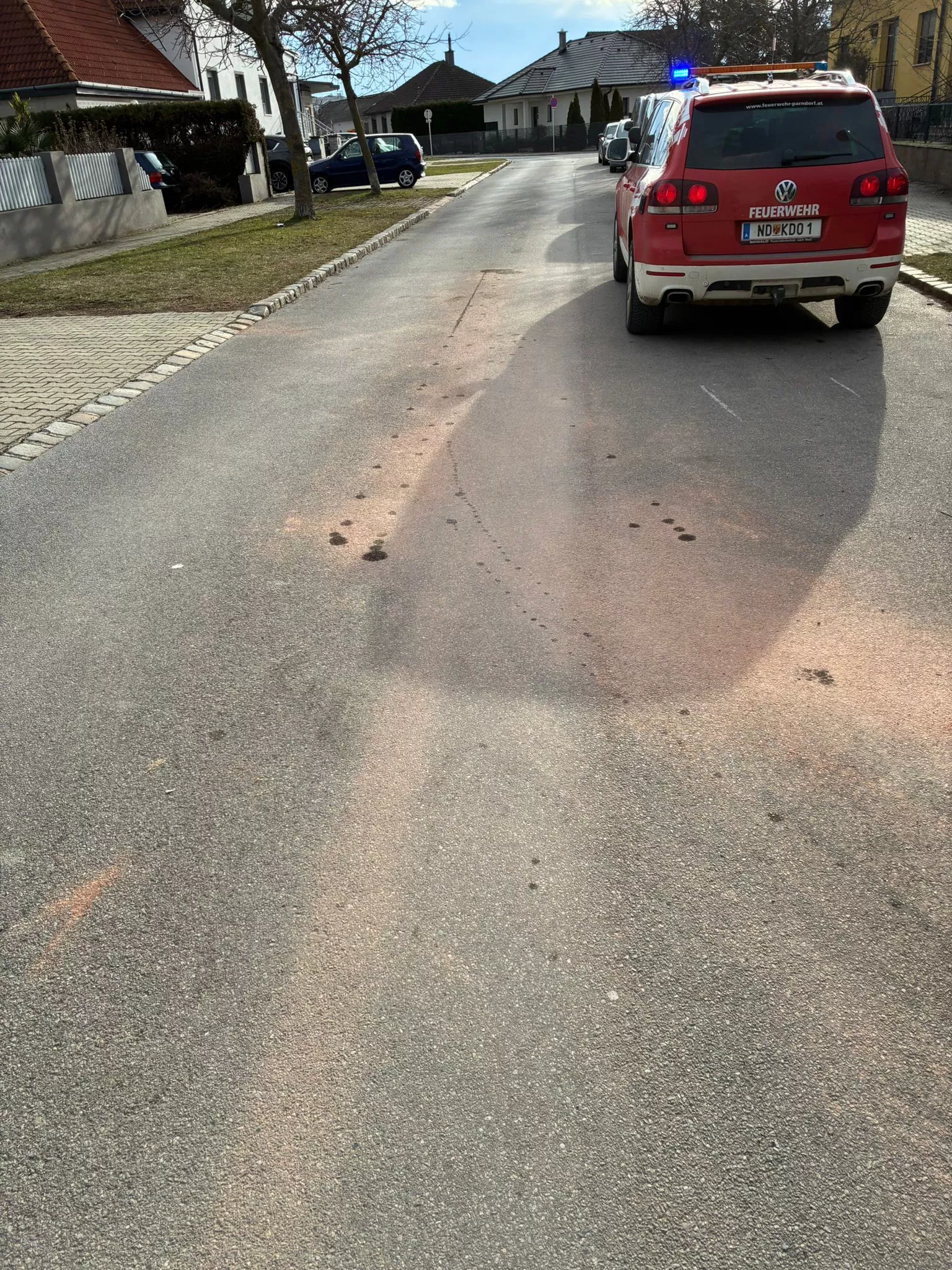 Bei der Ölspur konnte nach kurzer Erkundung schnell Entwarnung gegeben werden, da der Verursacher die ausgetretenen Betriebsmittel selbst gebunden hatte. Somit waren keine weiteren Tätigkeiten unsererseits notwendig.