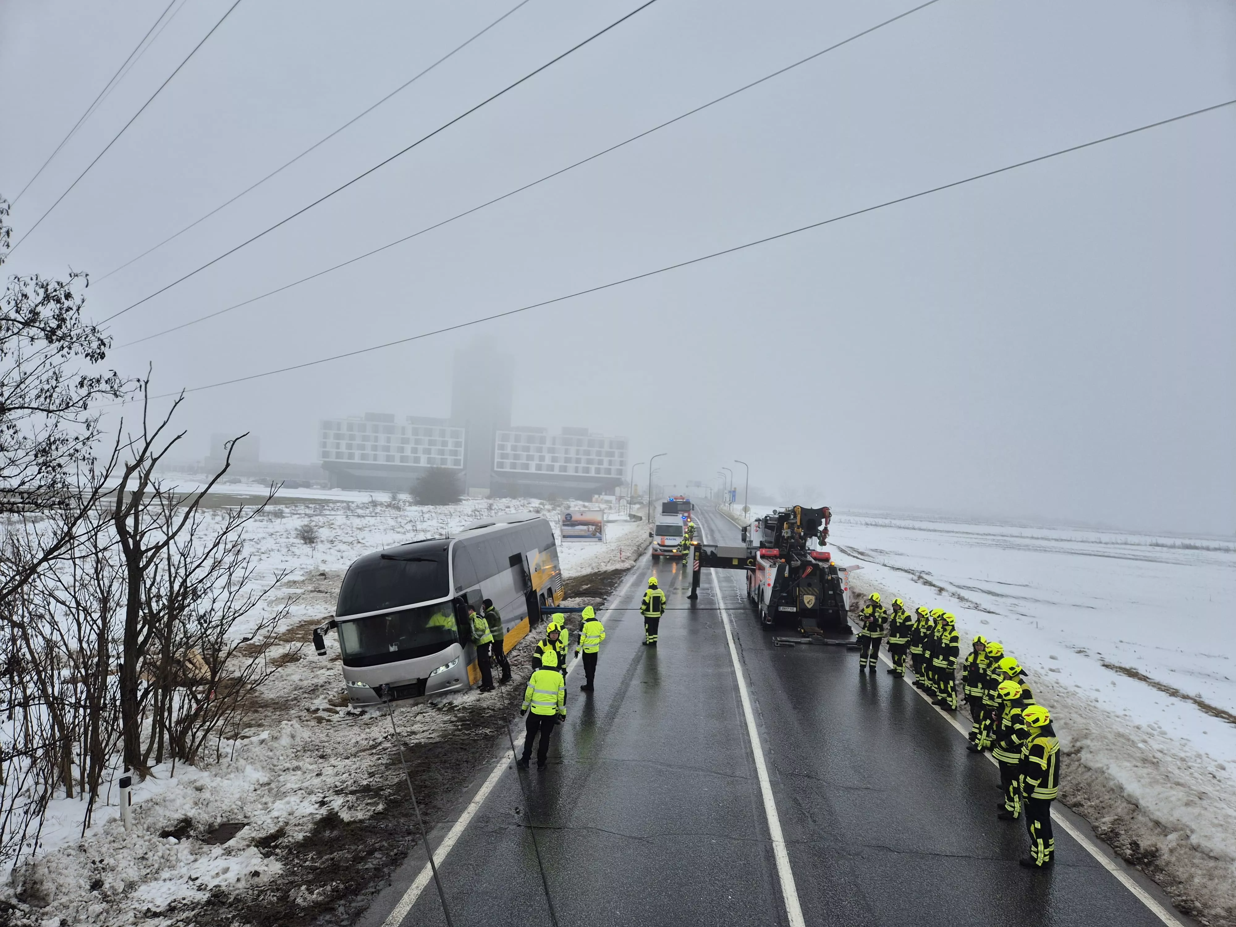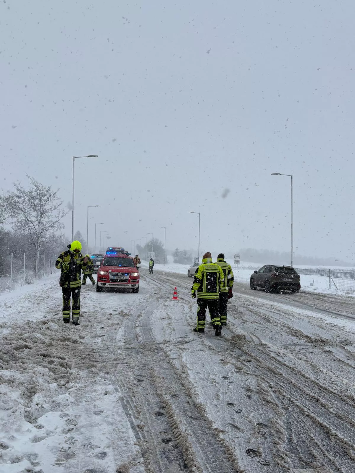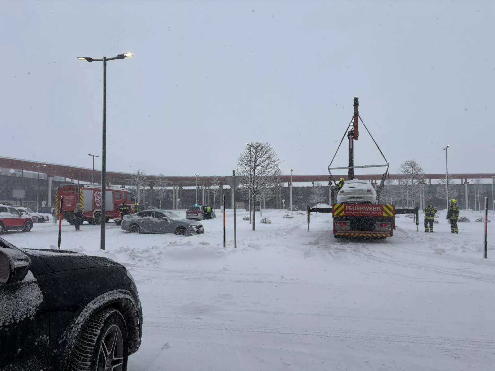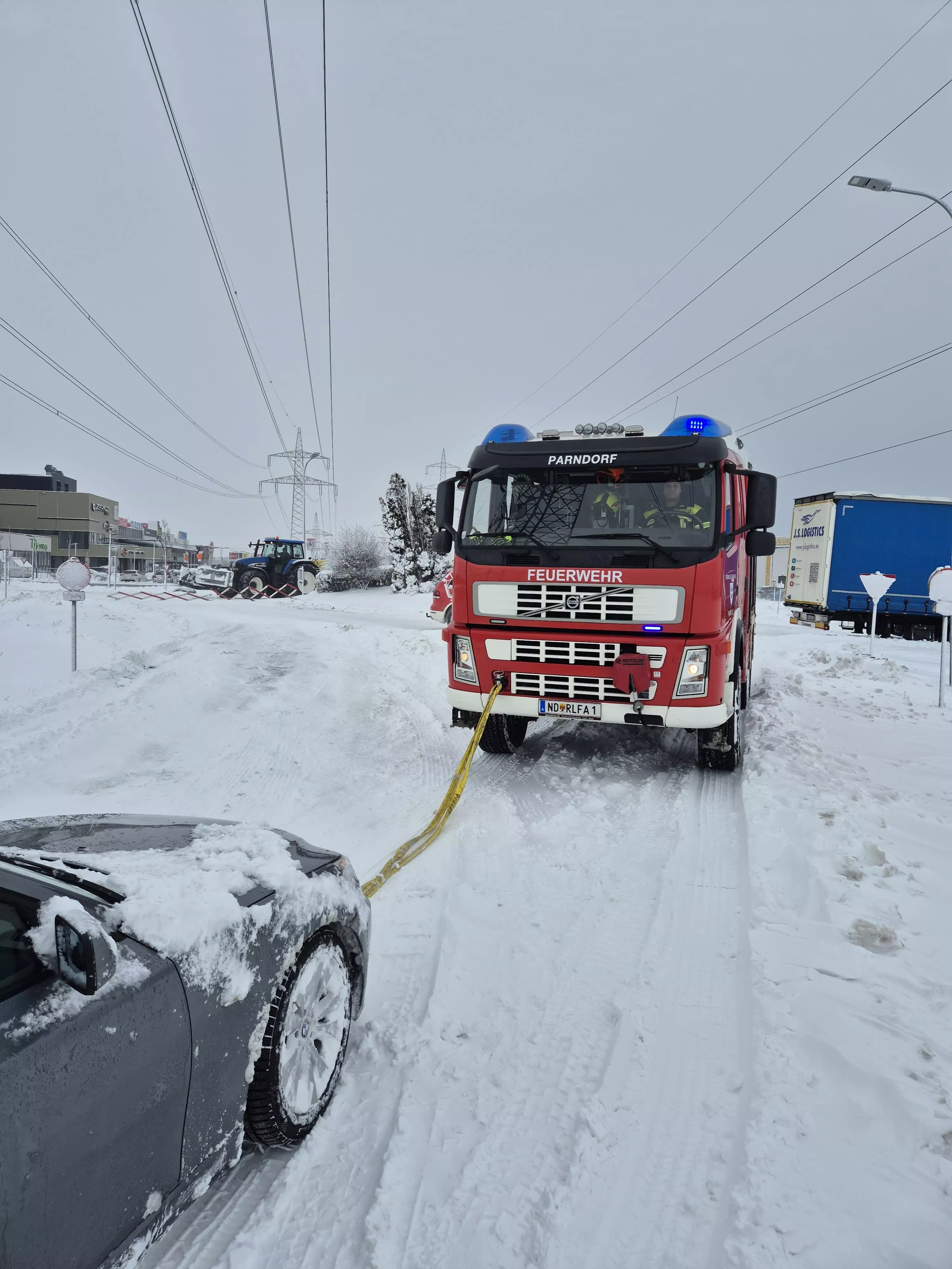 Der Tag begann mit einem Ölaustritt bei einem abgestellten PKW. Hier banden wir die ausgetretenen Betriebsmittel und wurden noch vor Ort zur beginnenden Einsatzserie alarmiert: Großteils wurden PKW, welche von der Fahrbahn abkamen und sich im Straßengraben festfuhren, per Abschleppseil bzw. Rundschlingen mit dem KDO oder RLFA geborgen. Zwei verunfallte und fahruntaugliche PKW wurden mittels Kran von der Unfallstelle verbracht und gesichert abgestellt. Drei verunfallte PKW mussten mittels Seilwinde unseres RLFAs geborgen werden; bei zwei feststeckenden Schwerfahrzeugen - einem Reisebus und einem Sattelschlepper - mussten wir trotz Bergungsversuchen Fachfirmen für die Bergung beauftragen.
