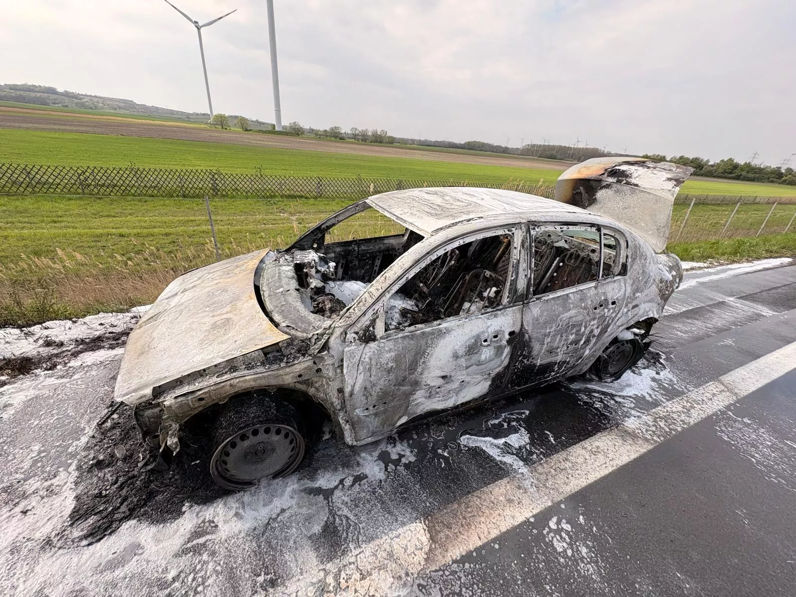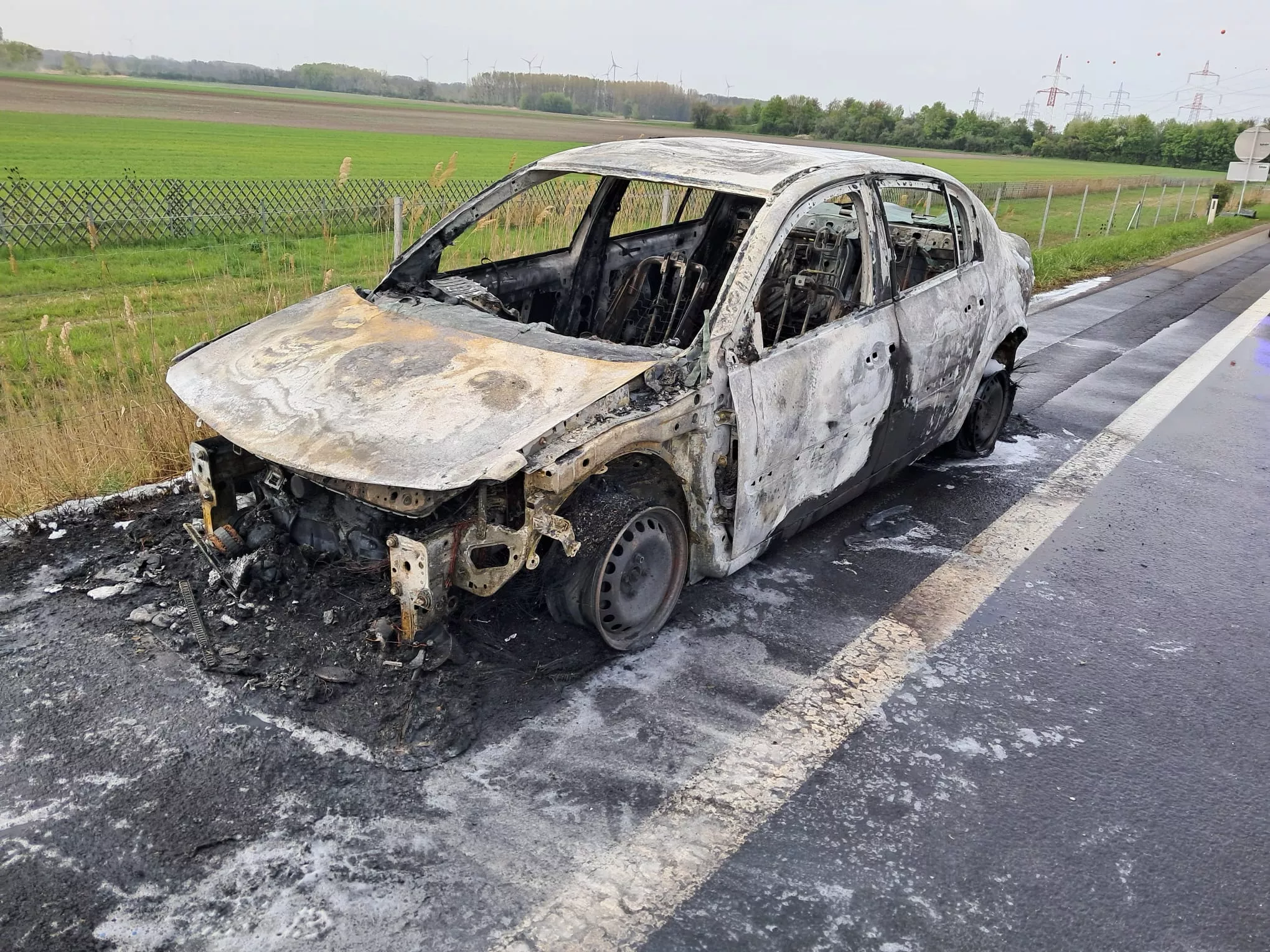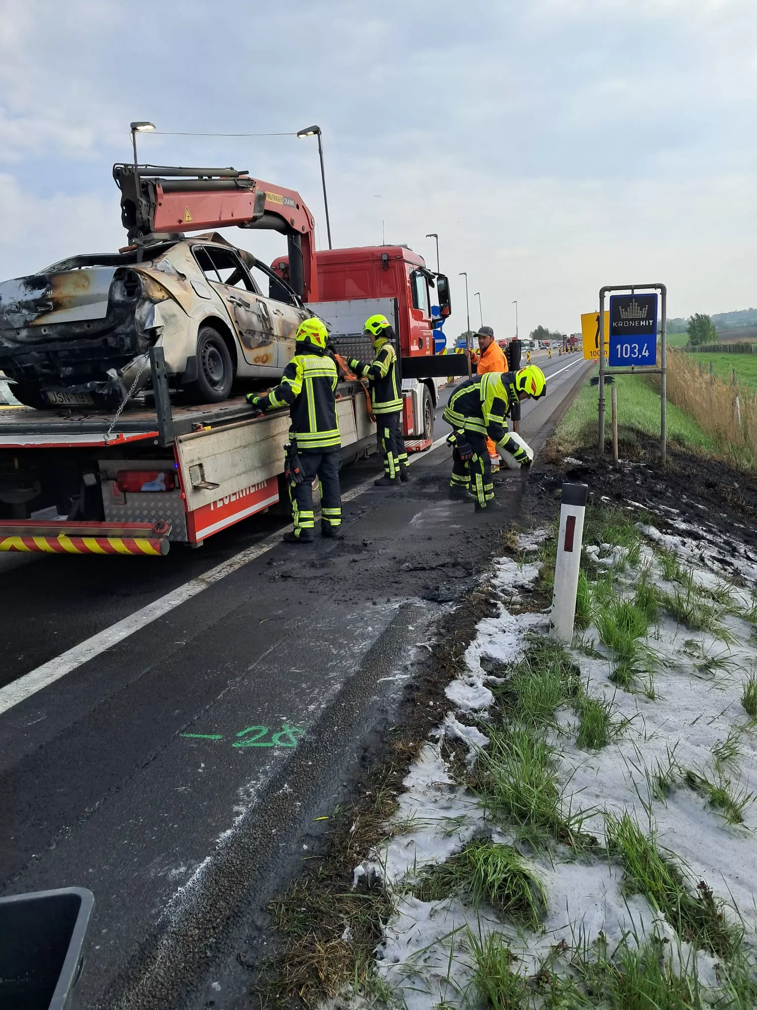 Nachdem das Fahrzeug mittels HD-Rohr und Schaumschnellangriff unseres Atemschutztrupps des GTLFAs abgelöscht wurde, konnte mit der Fahrzeugbergung begonnen werden. Während der ausgebrannte PKW vom Kranfahrzeug geborgen wurde, wurden zeitgleich ausgetretene Betriebsmittel gebunden und die Fahrbahn gereinigt. Es galt glücklicherweise keine verletzten Personen zu beklagen.