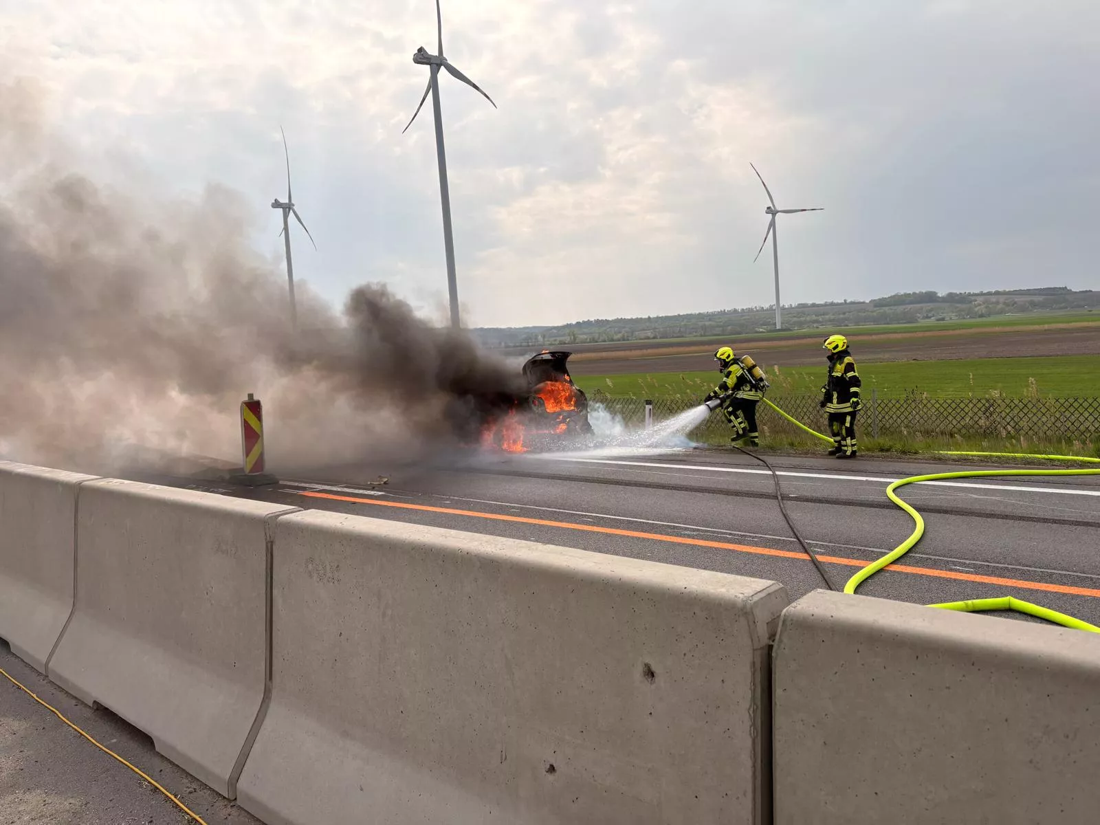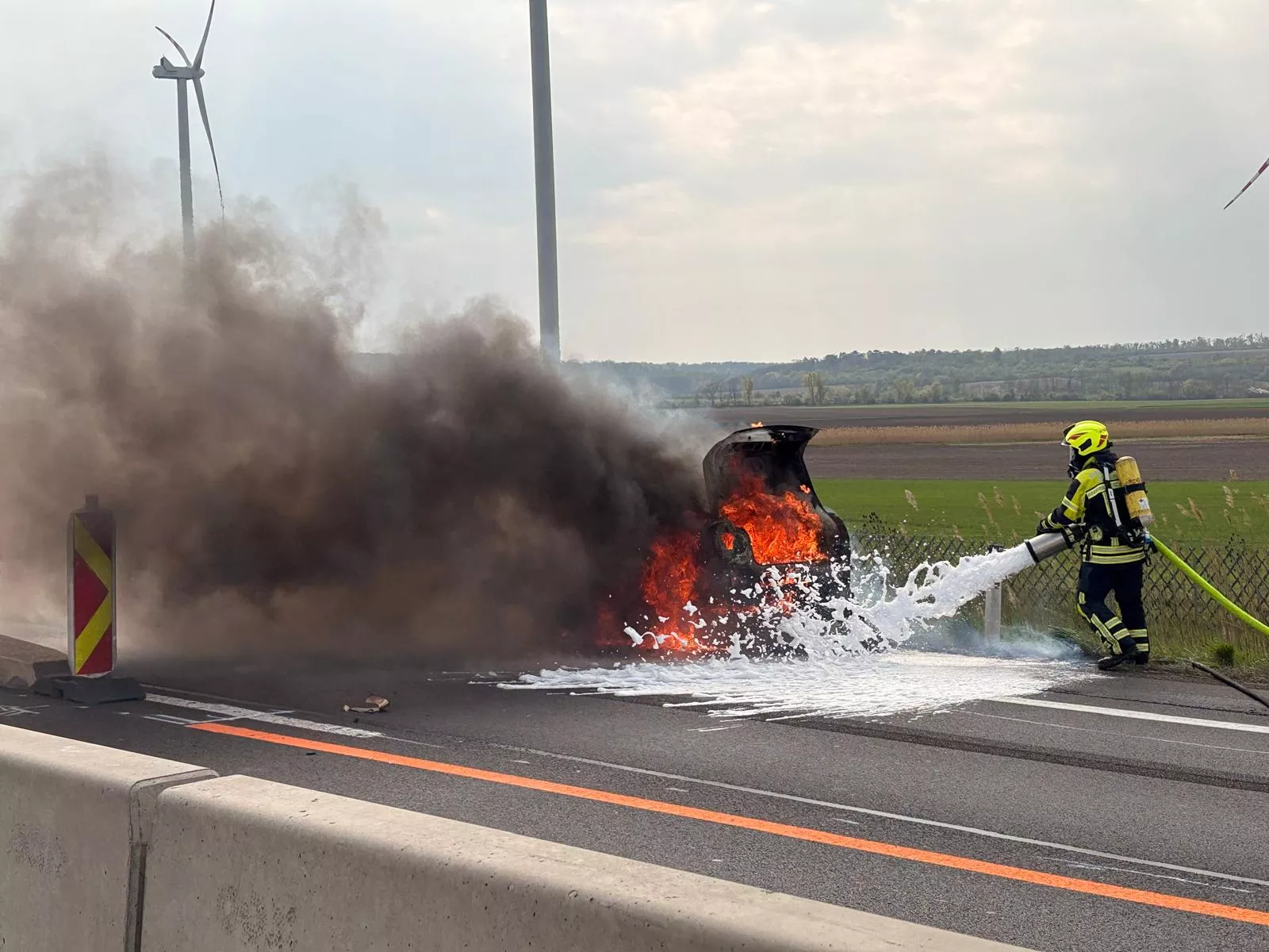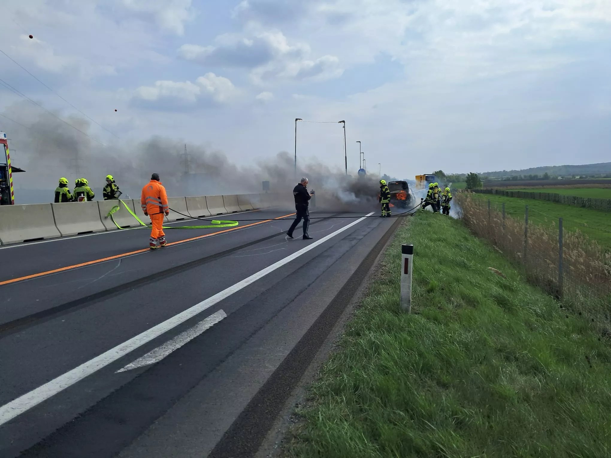 Heute galt es für uns um 14:57 Uhr einen Fahrzeugbrand auf der A4 Ostautobahn zu bekämpfen. Aufgrund der aktuellen Baustelle und der geänderten Spurführung musste die Brandbekämpfung unter einer Teilsperre von Polizei und Asfinag über die Betonschutzwand durchgeführt werden.