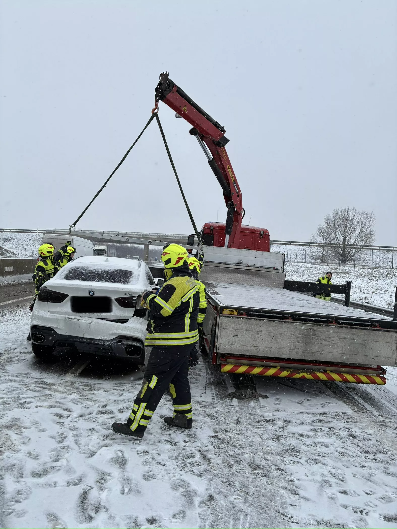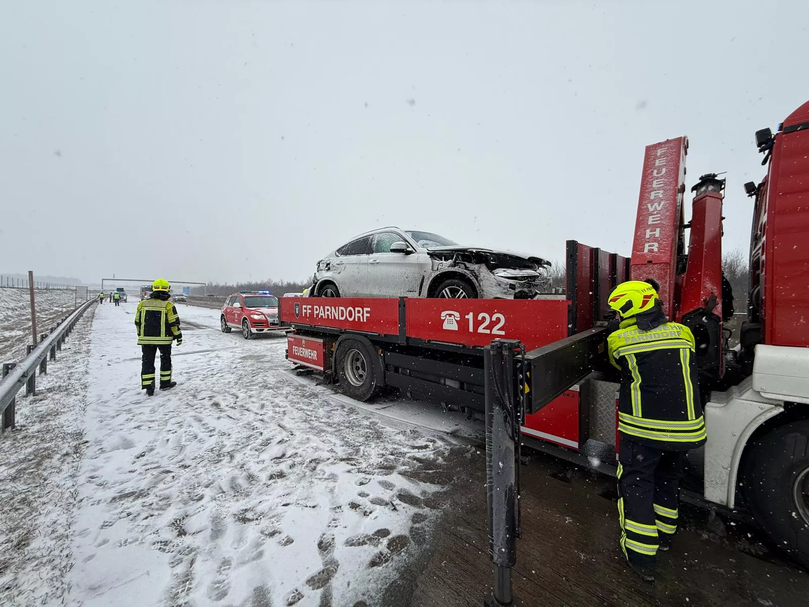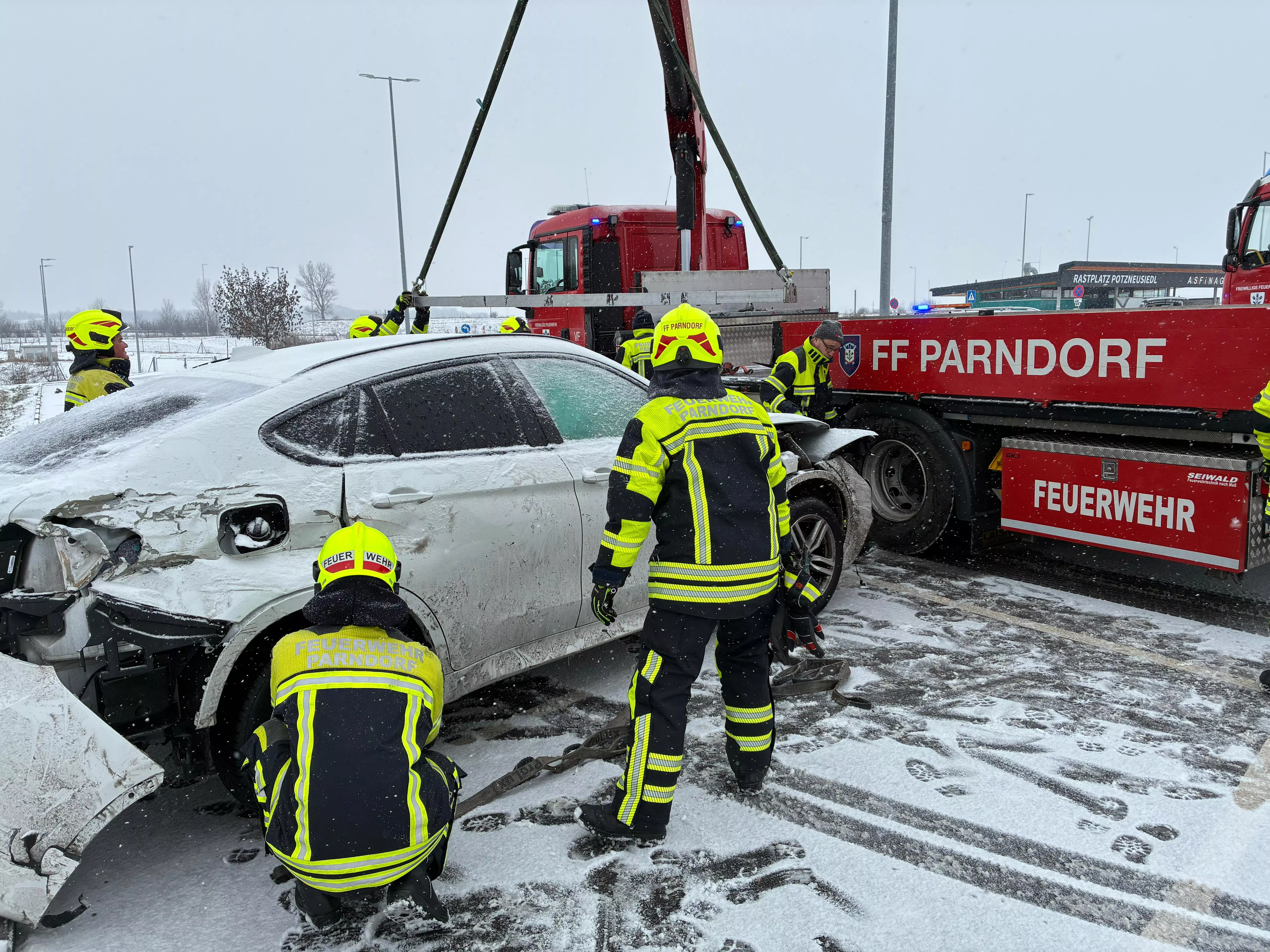 Der LKW konnte die Weiterfahrt fortsetzen, der PKW wurde mittels Kran geborgen und gesichert abgestellt.