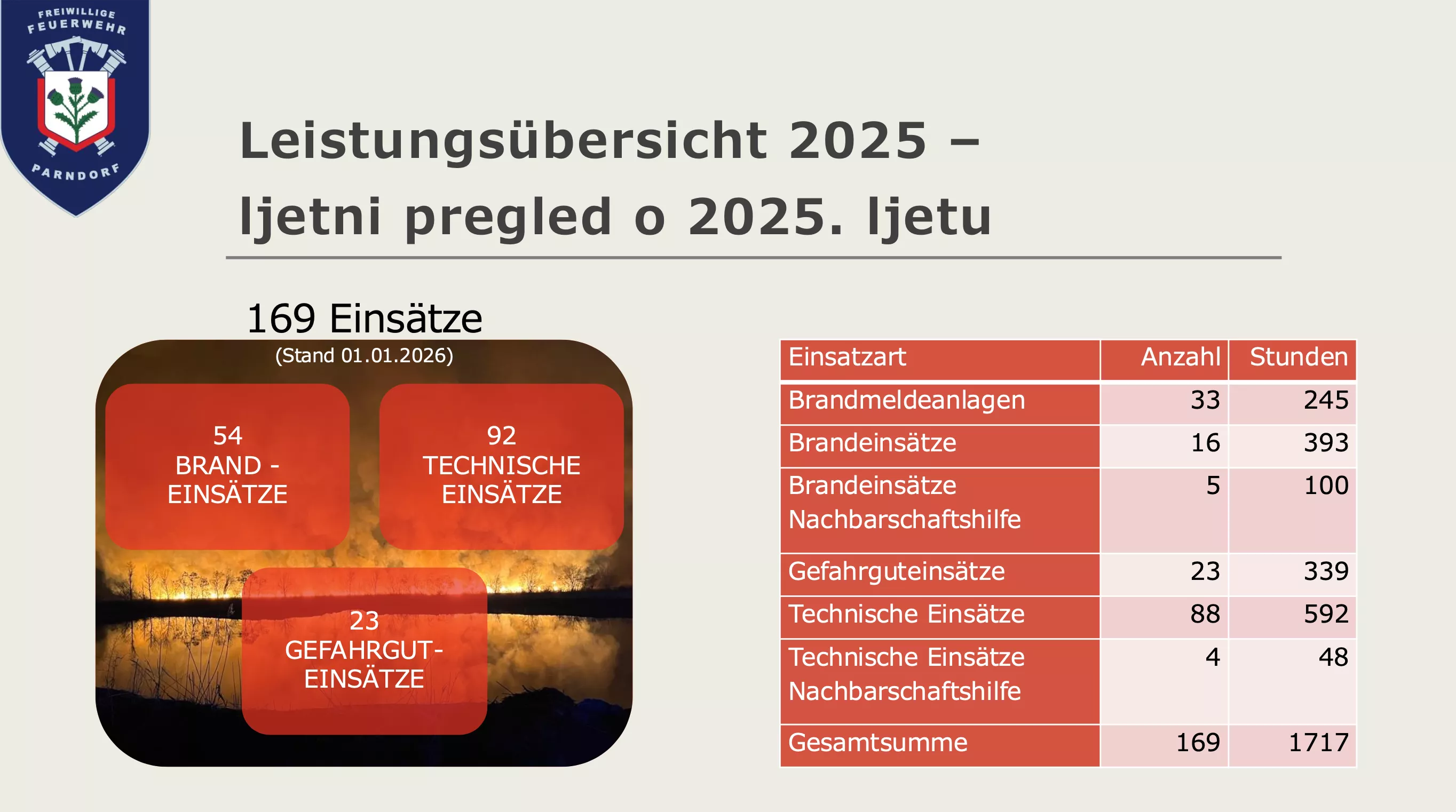 Nach einem Totengedenken präsentierte unser Kommandanten-Stellvertreter die Jahresstatistik des Jahres 2025. Mit 169 Einsätzen und über insgesamt 6900 Stunden im Einsatz-, Ausbildungs- und Dienstbetrieb stellte sich das vergangene Jahr im Vergleich zu den beiden Jahren zuvor zwar von den Einsatzzahlen als geringer, aber dennoch sehr arbeitsintensiv und aufwändig dar.
