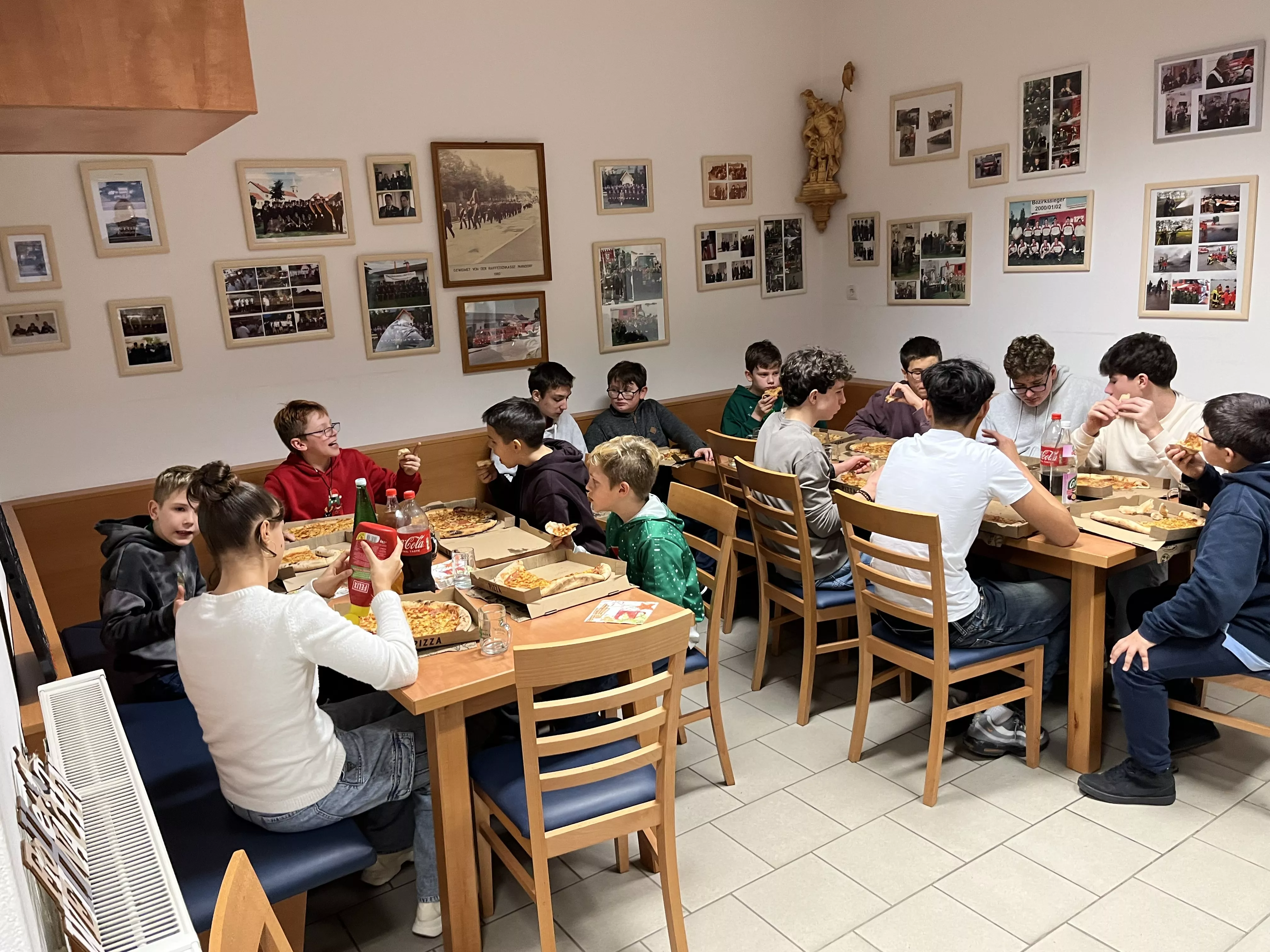 Unser Jugendleiter Stefan Helmut bereitete uns gemeinsam mit unseren Betreuern ein cooles, abwechslungsreiches und spielerisches Programm vor: Nach einem kurzen Jahresrückblick mit leckerem Punsch wartete eine Schnitzeljagd im Feuerwehrhaus, ein gemeinsames Abendessen - leckere Pizza - und ein kurzweiliges Pantomimespiel auf uns. Besonders gefreut hat es uns, dass unser Kommandantenstellvertreter, unser Leiter des Verwaltungsdienstes, unser Zugskommandant und unser Atemschutzwart bei unserer Weihnachtsfeier mit anwesend waren und uns stellvertretend die heurigen Weihnachtsgeschenke übergaben! Herzlichen Dank!!